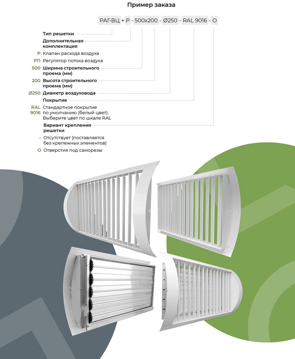 Рамка решетки имеет цилиндрическую форму повторяя круглую форму воздуховода, при этом посадочная часть имеет прямоугольную форму под размер строительного проема. В рамку устанавливаются вертикальные каплеобразные жалюзи, угол наклона которых регулируются независимо друг от друга для изменения направления воздуха.