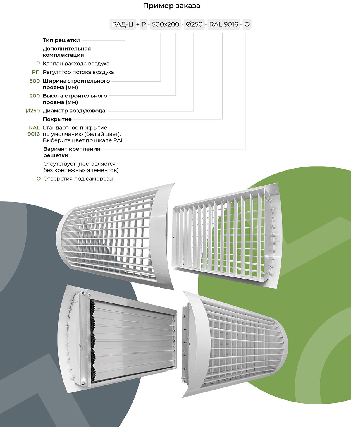 Рамка решетки имеет цилиндрическую форму повторяя круглую форму воздуховода, при этом посадочная часть имеет прямоугольную форму под размер строительного проема. В рамку устанавливаются 2 ряда каплеобразных жалюзи: лицевые – горизонтальные, тыльные – вертикальные. Угол наклона жалюзи регулируются независимо друг от друга, изменяя направление воздуха.
