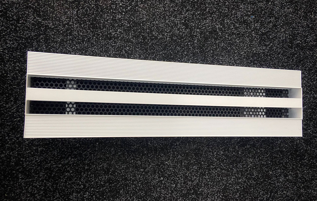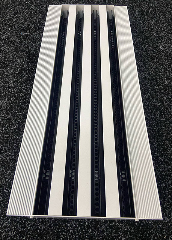 Конструкция профиля решетки предусматривает фланец с углублениями и отверстиями для лучшей адгезии финишного материала по длине решетки и заглушки с торца.  После монтажа решетки, видимой частью в помещении остаются только щели.